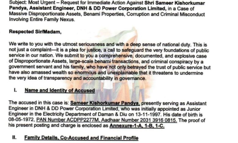सी॰ एम॰ जैन | भारत में भ्रष्टाचार की कहानियों की कभी कमी नहीं रही, लेकिन कुछ मामले अपनी निडरता, व्यापकता और बेशर्मी के कारण बाकियों से कहीं आगे निकल जाते हैं। डीएनएच और डीडी पावर कॉर्पोरेशन लिमिटेड में सहायक अभियंता के रूप में कार्यरत समीर किशोरकुमार पांड्या की कहानी ऐसा ही एक मामला है। संदिग्ध भूमि सौदों और अस्पष्ट जीवनशैली विकल्पों की अफवाहों से शुरू हुआ यह मामला समय के साथ आय से अधिक संपत्ति, बेनामी लेनदेन, मिलीभगत से धोखाधड़ी और सरकारी पद के दुरुपयोग की ओर इशारा करने वाले सबूतों के एक अकाट्य ढेर में बदल गया है। यह सिर्फ़ एक सरकारी कर्मचारी की कहानी नहीं है; यह उस व्यवस्था का आईना है जो अक्सर सार्वजनिक ज़िम्मेदारी वाले व्यक्तियों को चुपचाप अपनी आधिकारिक शक्ति को निजी साम्राज्यों में बदलने की अनुमति देती है।