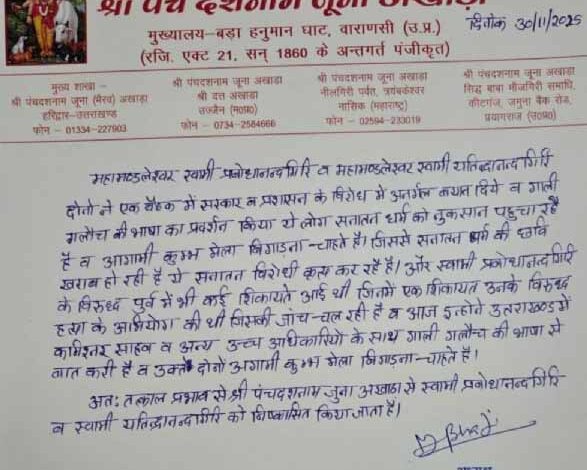 मोहन भारती महाराज ने कहा कि दोनों संतों ने एक बैठक में सरकार व प्रशासन के विरोध में अनर्गल बयान दिये व अभद्र भाषा का प्रयोग किया। ये लोग सनातन धर्म को नुकसान पहुंचा रहे हैं। आगामी कुम्भ मेला बिगाड़ना चाहते हैं, जिससे सनातन धर्म की छवि खराब हो रही है। ये सनातन विरोधी कृत्य कर रहे हैं। साथ ही कहा कि स्वामी प्रबोधानन्द गिरि के विरुद्ध पूर्व में भी कई शिकायतें आई थी, जिनमें एक शिकायत उनके विरुद्ध हत्या के अभियोग की थी। जिसकी जांच चल रही है। आज इन्होंने उत्तराखण्ड के उच्च अधिकारियों के साथ अभद्र भाषा में बात की है। दोनों संत अगामी कुम्भ मेला बिगाड़ना चाहते हैं। इसलिए तत्काल प्रभाव से श्री पंचदशनाम जूना अखाड़ा से स्वामी प्रबोधानन्द गिरि व स्वामी यतींद्रानंद गिरि को निष्कासित किया जाता है।