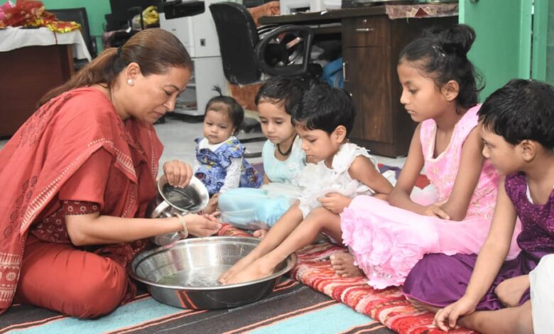 देहरादून, 1 अक्टूबर। केदारपुरम स्थित राजकीय बालिका निकेतन में महिला सशक्तिकरण एवं बाल विकास मंत्री रेखा आर्या ने नवरात्रि के पावन पर्व पर कन्याओं का कंजक पूजन किया। उन्होंने नन्हीं कन्याओं के चरण पखारकर उनका पूजन किया और उनके साथ बैठकर भोजन ग्रहण किया।