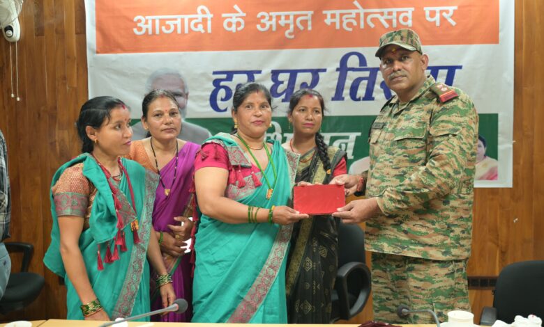 रुद्रप्रयाग। आजादी के अमृत महोत्सव के अंतर्गत हर घर तिरंगा अभियान के तहत विकास भवन सभागार में सैनिक रक्षाबंधन कार्यक्रम का आयोजन किया गया। इस दौरान हरियाली स्वायत्त सहकारी समिति रतूड़ा, जै रुद्रनाथ स्वायत्त सहकारी समिति जवाड़ी, प्रगति स्वायत्त सहकारी समिति चंद्रापुरी स्वयं सहायता समूहों की महिलाओं एवं ब्रह्मकुमारी आश्रम की बहनों ने आर्मी, पुलिस के जवानों तथा उपस्थित अधिकारियों को पिरूल और रुद्राक्ष से बनी राखियां बांधकर उनके स्वस्थ, सुख और समृद्ध जीवन की कामना की।